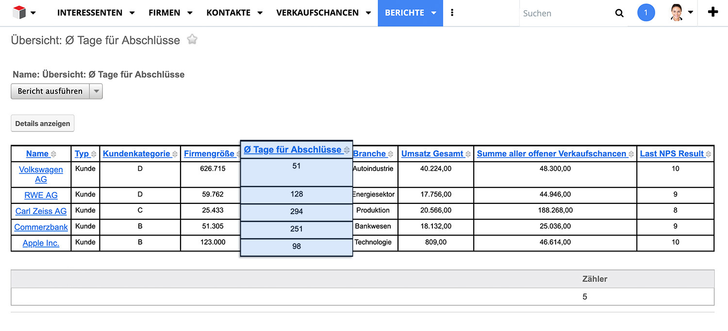 Beispiel Bericht:: Übersicht der Kunden - Durchschnittliche Dauer für einen Abschluss.