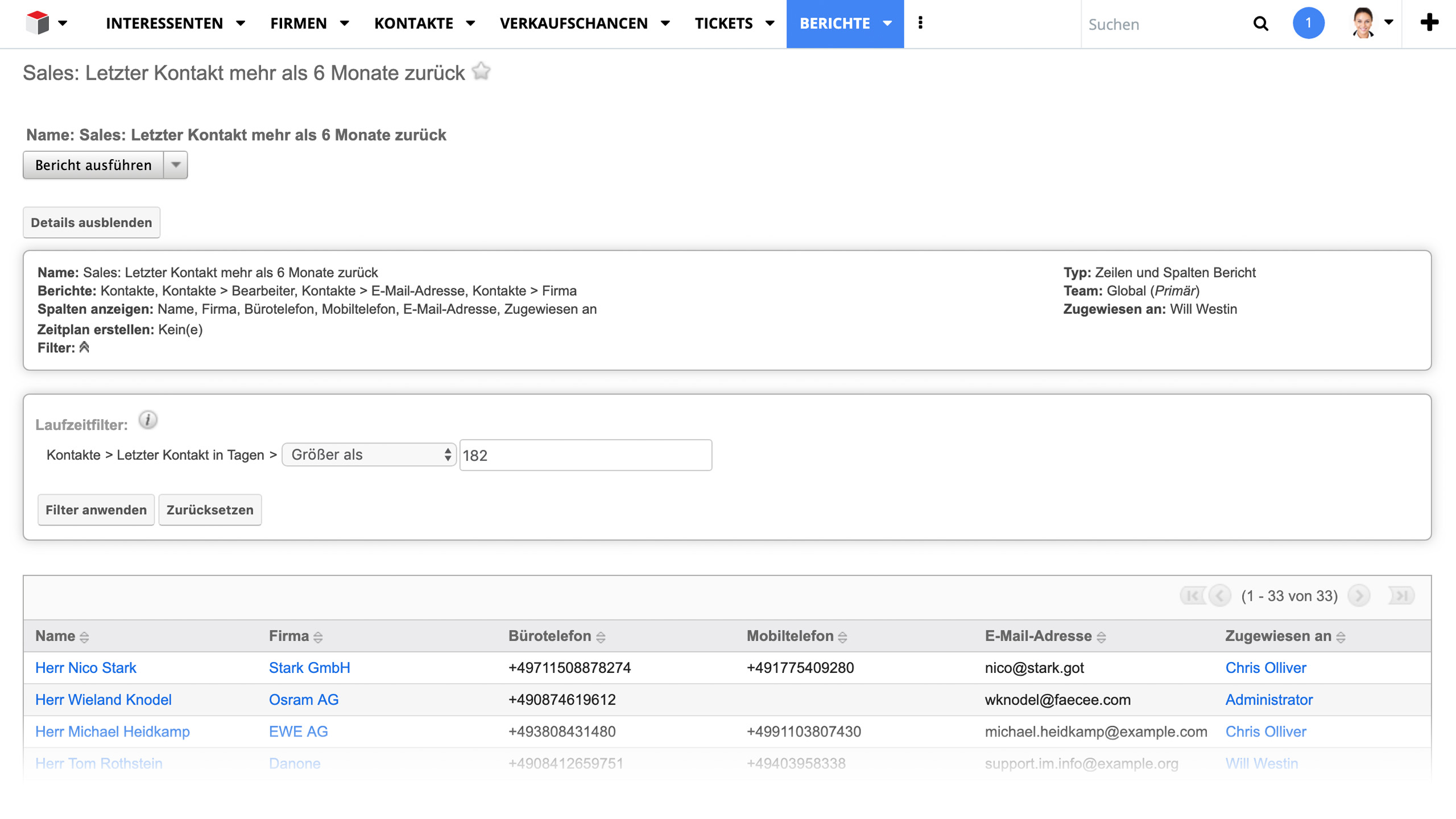 Beispiel Bericht: Kontakte - Letzter Kontakt mehr als 6 Monate zurück