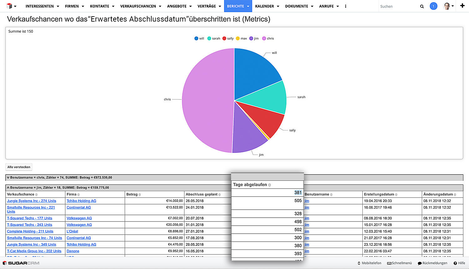 Schaut euch die einzelnen Angebote/Kunden an; bei Sugar gibt es seit Sugar 7.11 die Actionable Drill Through Charts. Damit kannst du im Dashboard auf ein Diagramm oder ein Segment klicken und siehst sofort die dahinter stehenden Datensätze als Liste. Beispiel Sales-Funnel: Wenn du auf eine Phase klickst, erhältst du eine Liste aller Kontakte, die sich darin befinden.