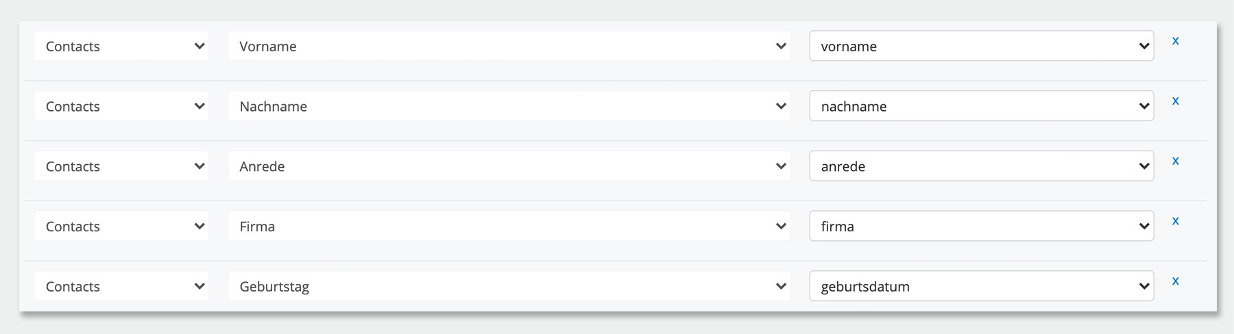 Hier haben wir die UI weiter verbessert. Außerdem wurden Felder vom Typ „Beziehung„, welche nicht korrekt nach CleverReach übertragen werden können, ausblendet. Das Verknüpfungsfeld Firmenname in den Kontakten ist allerdings weiterhin vorhanden.