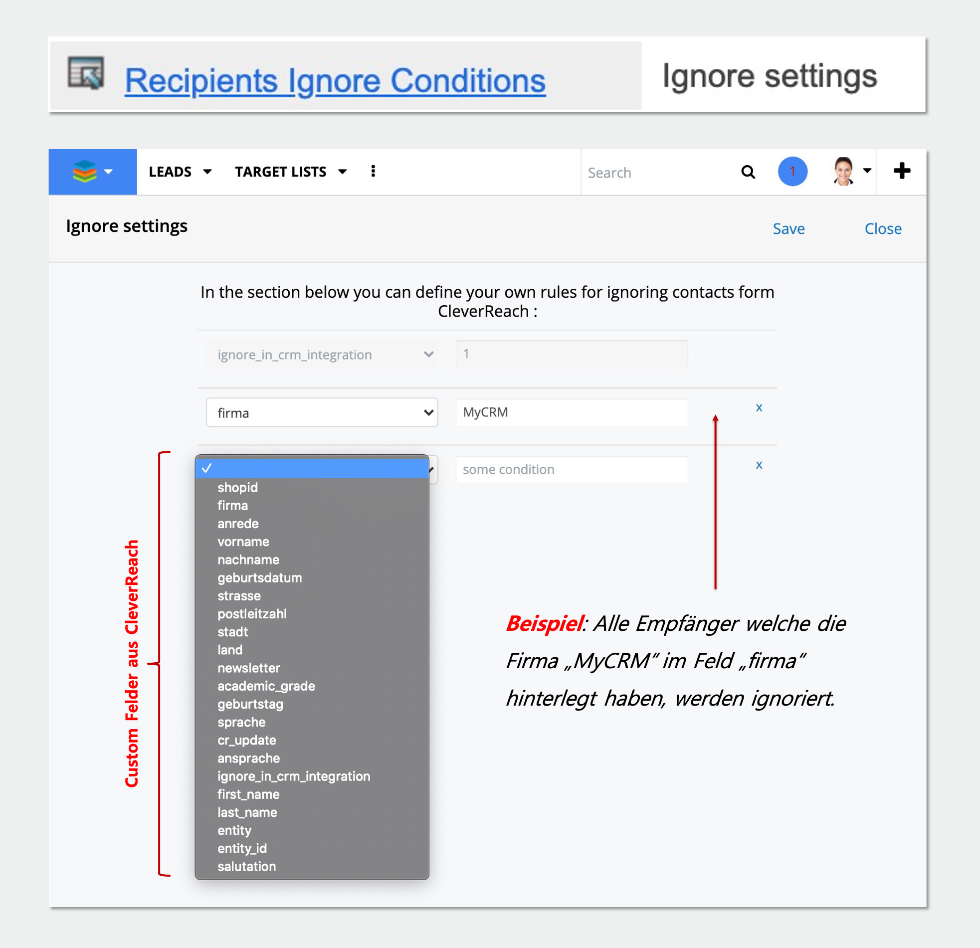 Hinweis: Bei Default kann das Feld „ignore_in_crm_intergration“ genutzt werden. Das muss in CleverReach erstellt und mit dem Wert „1“, bei allen zu ignorierenden Empfängern belegt werden.