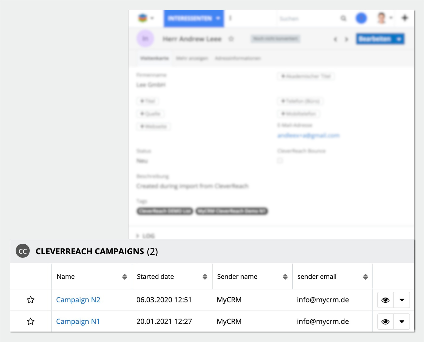 Neues Subpanel für die CleverReach Campaigns. Hier siehst du auf einem Blick, welche Kampagnen der Kontakt/Interessent erhalten hat. Dieses Subpanel ist eine Ergänzung zum bereits vorhandenen Subpanel „CleverReach Campaign Log“ und zeigt nur die Kampagnen, ohne die Details zu den Aktivitäten wie „Geklickt“, „Erhalten“ usw..