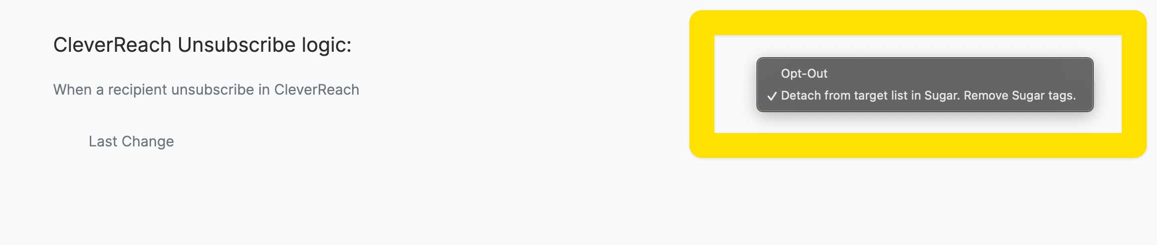 Die CleverReach-Schnittstelle hat schon immer das globale Abmelden unterstützt. Wenn sich jemand vom Mailing abmeldet, wird die E-Mail-Adresse automatisch als abgemeldet in Sugar markiert.