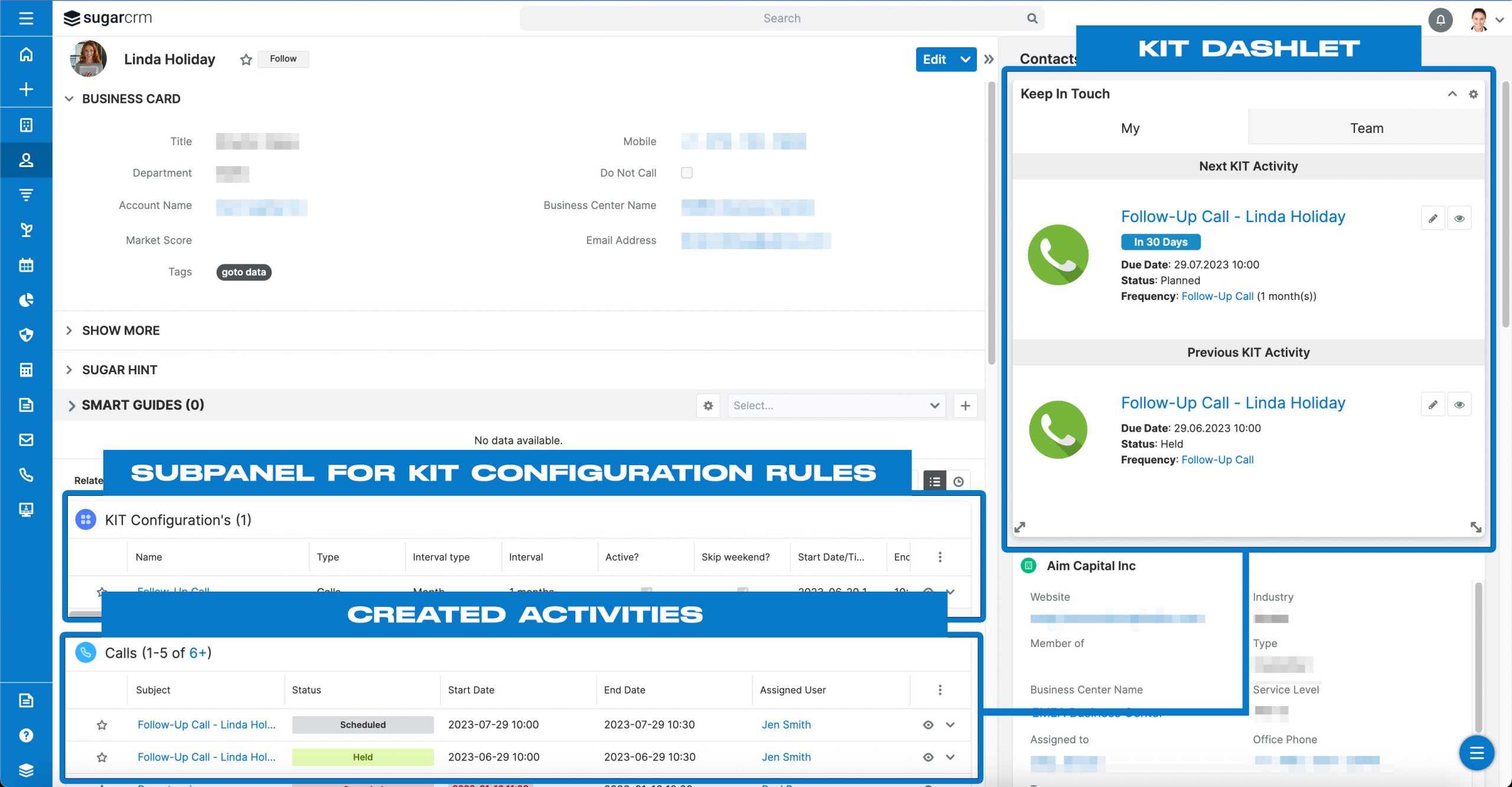 Fällt es Ihnen schwer, den Überblick über Ihre Kundenkontakte zu behalten? Mit dem Add-on „Keep In Touch“ können Sie festlegen, wie oft Sie sich bei Ihren potenziellen Kunden, Leads oder Kontakten melden möchten, z. B. alle 30 Tage einen Anruf und alle 90 Tage einen Besuch vor Ort.