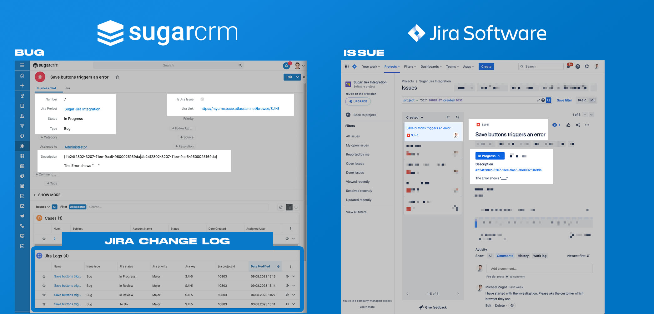 Service-User können Jira-Issues/Bugs direkt von Sugar aus erstellen, indem sie einen Fehler erstellen und das zugehörige Projekt in einem Sugar Case-Modul auswählen. Alle wichtigen Informationen und Updates aus Jira wie Status, Prio, Typ und Konversation zwischen Support und Entwicklung werden von Jira zu Sugar ausgetauscht. Jeder Mitarbeiter arbeitet in seiner gewohnten Umgebung und erhält Informationen von der anderen Seite, um die Arbeit effizient und nachvollziehbar zu erledigen.