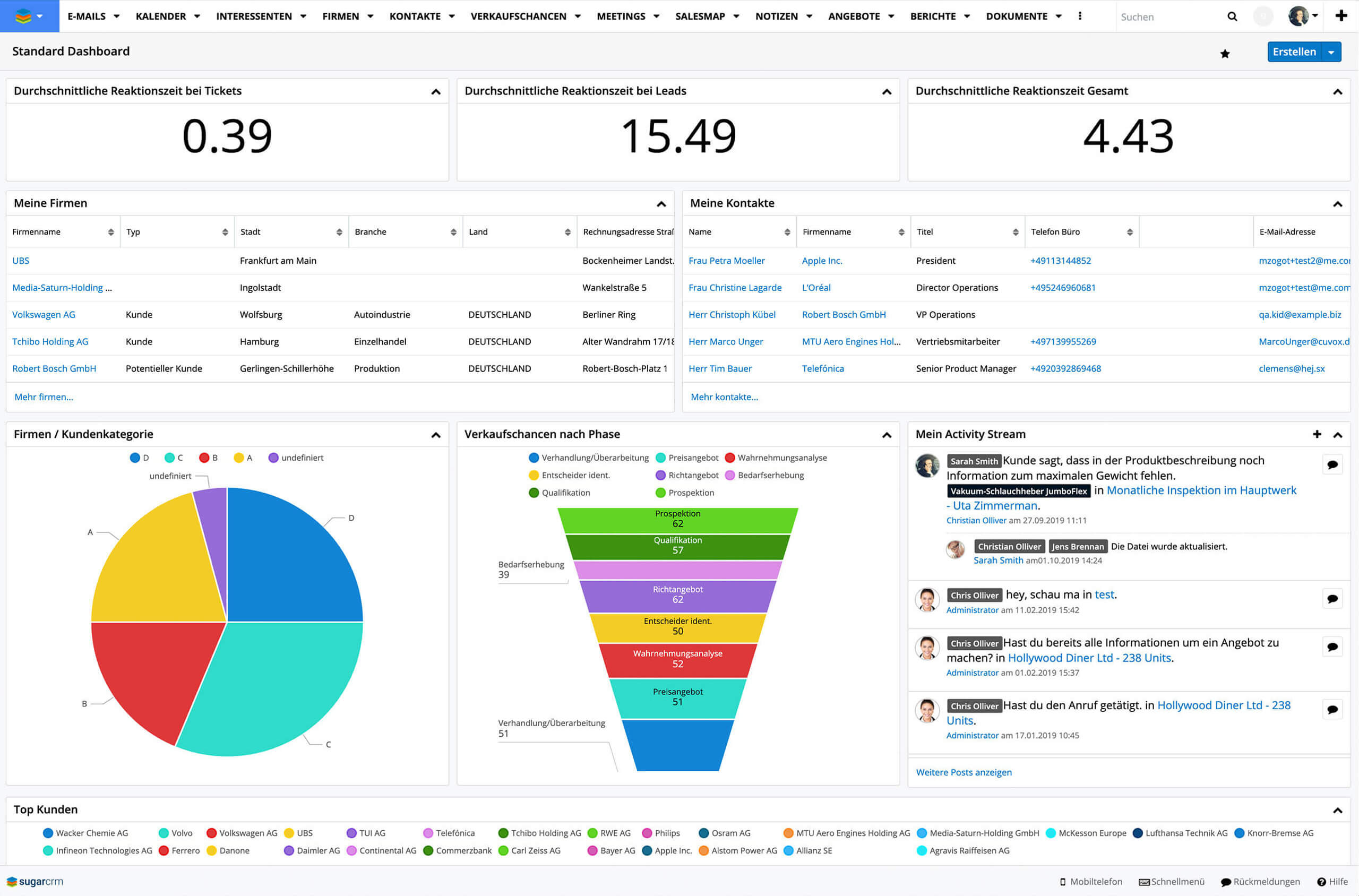 • Features Sugar Sell (Auszug): Kontaktverwaltung, Verkaufschancen, Kalender- und Aktivitätenmanagement, Berichte, Prognosen, Workflows, Produktkatalog, Verträge, Datenschutz-Modul, Wissensdatenbank (Wiki)Eine Übersicht aller Features sowie eine Gegenüberstellung zu Sugar Serve gibt es in diesem Blogartikel.