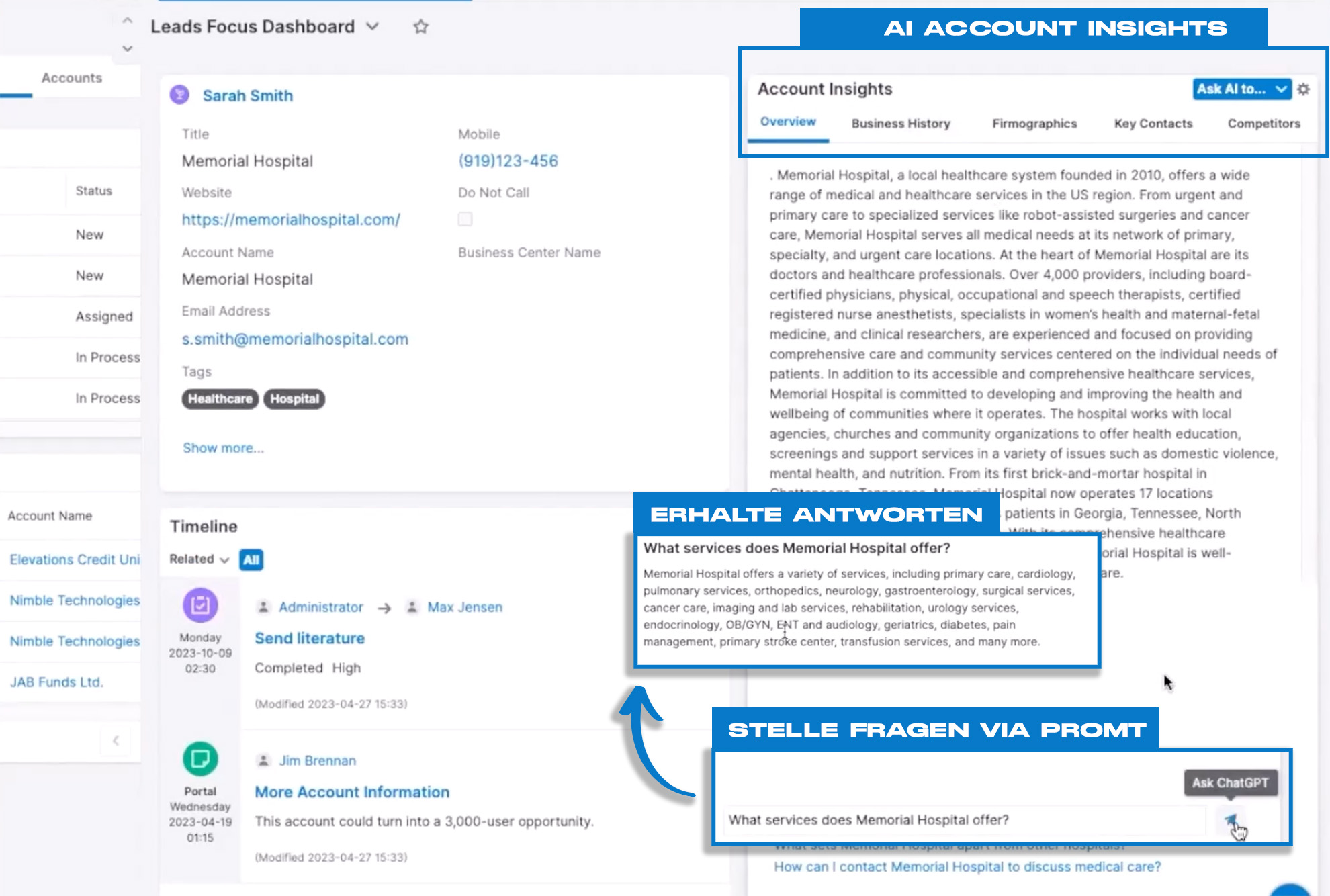 Aber was wäre, wenn diese Daten automatisch mit Branchenstatistiken, Konjunkturdaten oder ähnlichen Informationen angereichert würden, um daraus Handlungsempfehlungen abzuleiten? Ihr habt Kontakte in einem Bereich, der von der aktuellen Wirtschaftslage profitiert? Dann sucht die KI im CRM-Tool nach Leads, die der Vertrieb ansprechen kann. Zum Beispiel schlägt sie auch Kunden vor, die lange Zeit nichts mehr gekauft haben. Oder sie sucht auf LinkedIn nach Personen, die du anschreiben könntest und macht entsprechende Vorschläge zur Kontaktaufnahme. Zusätzlich erstellt sie passende Marketingmaßnahmen und formuliert Textvorschläge für eine E-Mail-Kampagne.