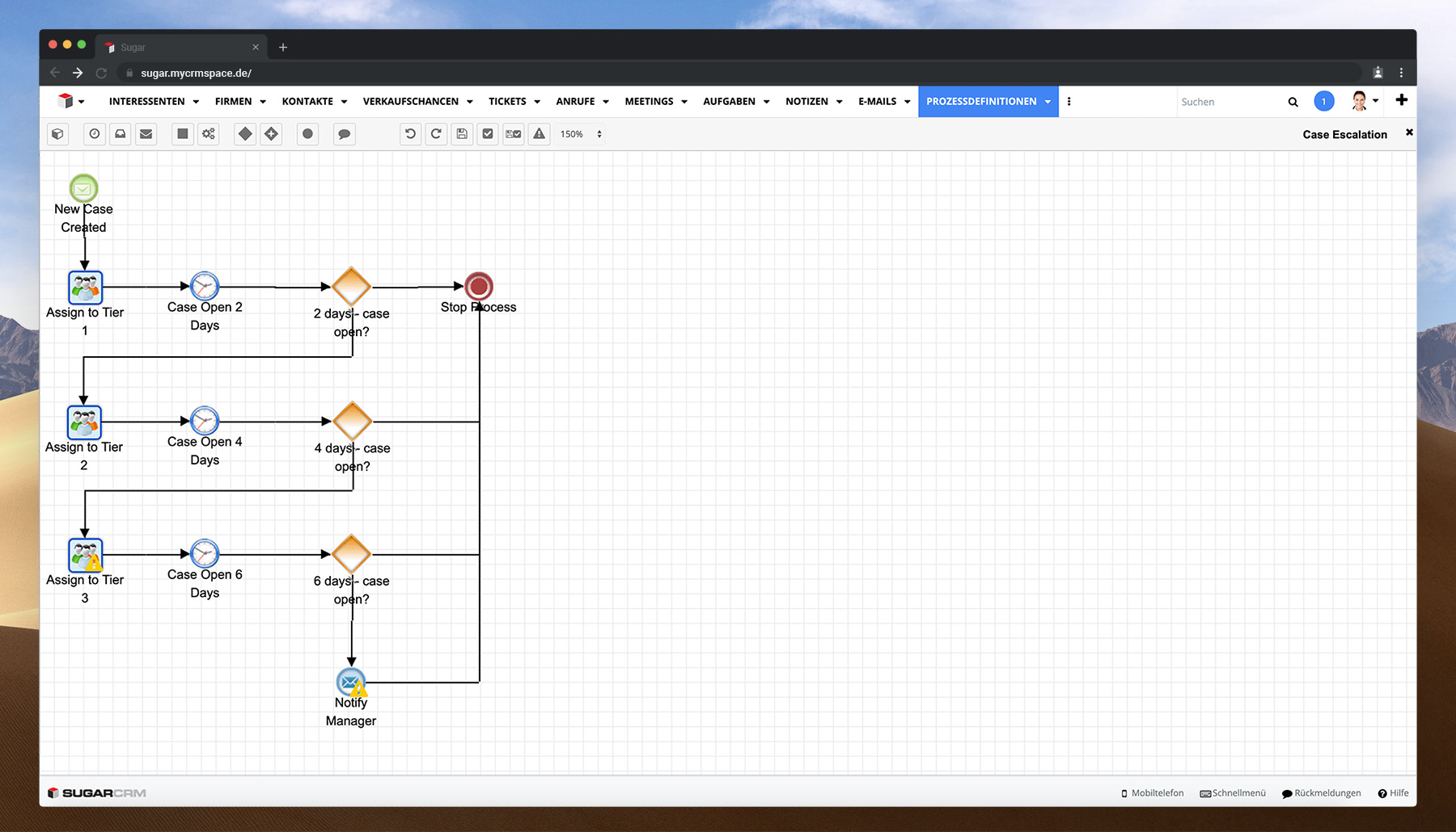 Das lässt sich beispielsweise über die Workflows von Sugar lösen. Ein Workflow für die Bearbeitung eines Tickets samt integrierter Eskalation könnte so aussehen: