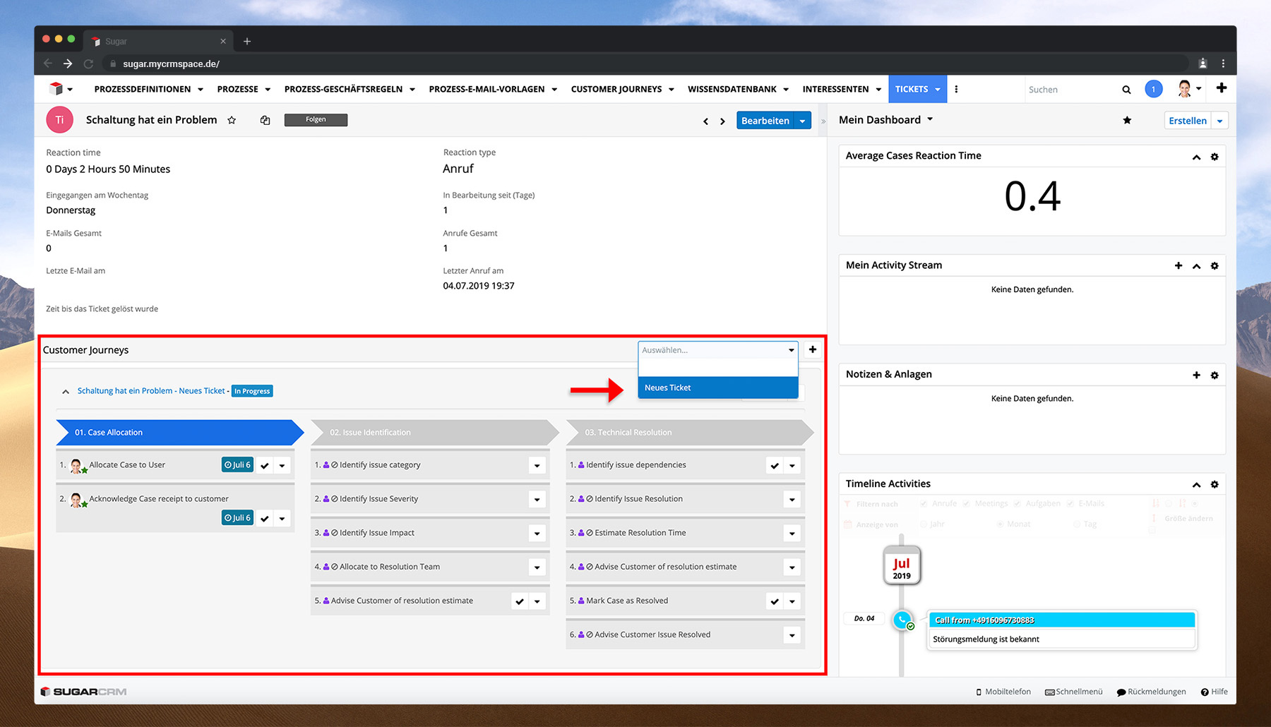 Eine interessante Erweiterung für den Kundenservice mit SugarCRM ist auch die Customer Journey Solution. Eine Customer Journey ist letztlich eine Abfolge verschiedener Aktivitäten unterteilt in Phasen. Das lässt sich nicht nur für den Kaufprozess, sondern eben auch für die Bearbeitung von Support-Anfragen wunderbar nutzen. Von der Anfrage/Ticketeingang, Zuweisung, Bearbeitung und dem Schließen mit eventueller Zufriedenheitsumfrage lassen sich alle Schritte so übersichtlich abbilden.