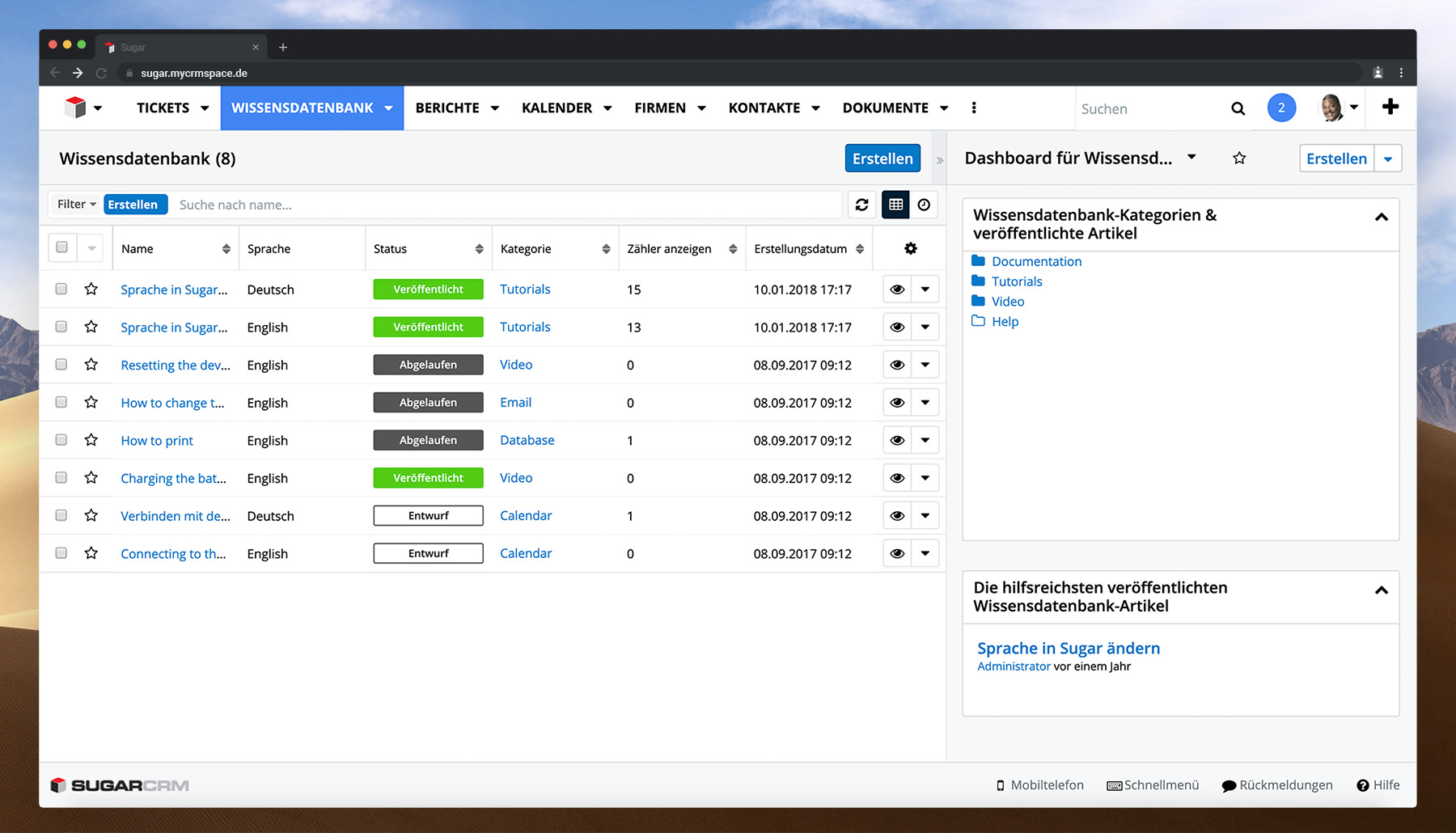 Das Knowledge-Base-Modul (Wissensdatenbank), verfügbar für alle Sugar-Editionen, ermöglicht es, Wissen in Form von „Artikeln“ zu teilen, das Ganze sowohl intern als auch extern (Self-Service).