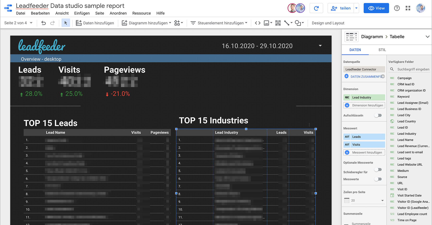 Es gibt eine Klick-Integration von Leadfeeder für Google Data Studio. Sie ermöglicht, auch komplexe Analysen mit wenigen Klicks einfach umzusetzen.