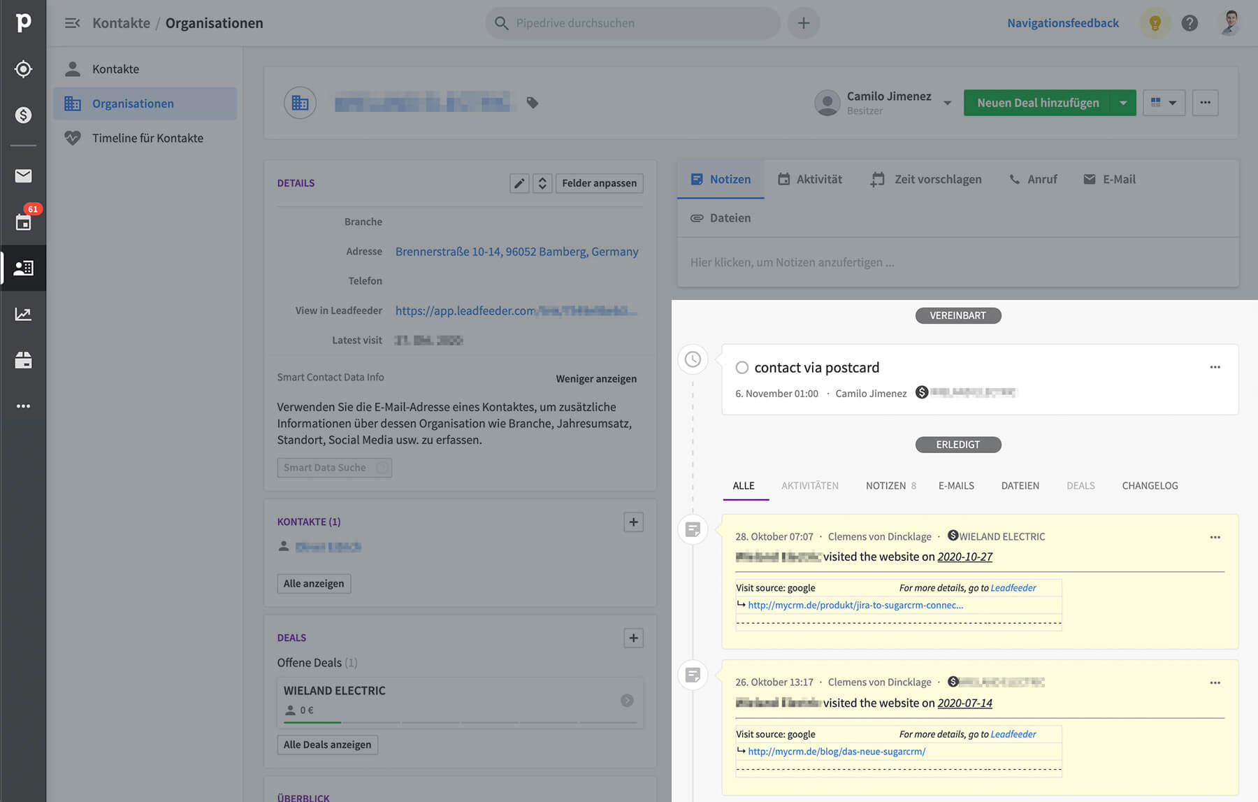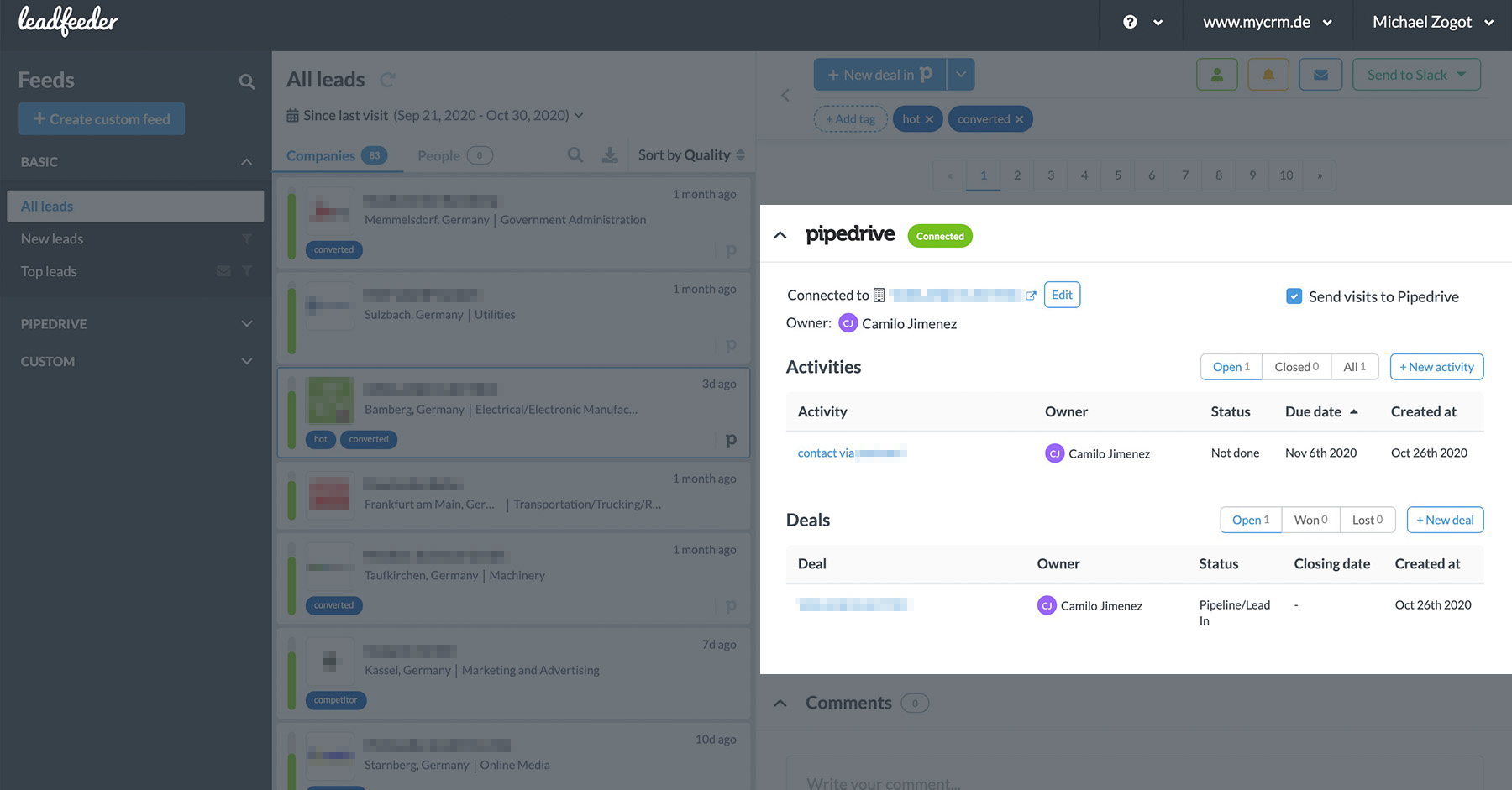 - Außerdem lassen sich direkt in Leadfeeder auch Deals und Aktivitäten in Pipedrive anlegen, das gilt umgekehrt auch für bestimmte Pipedrive-Aktivitäten, die in Leadfeeder angezeigt werden, beispielsweise offene Follow-up-Aufgaben