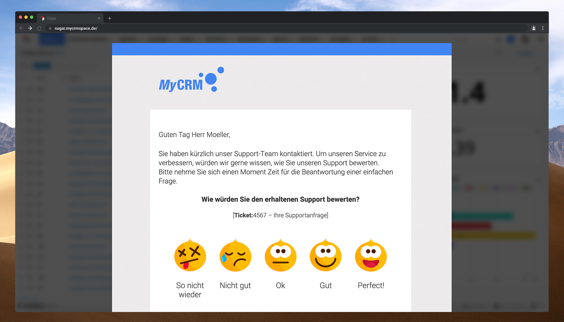 Wir haben ein Add-on für SugarCRM entwickelt, mit dem ihr NPS® und CSAT Umfragen zur Kundenzufriedenheit direkt im CRM aus einem Support-Ticket heraus verschicken könnt.