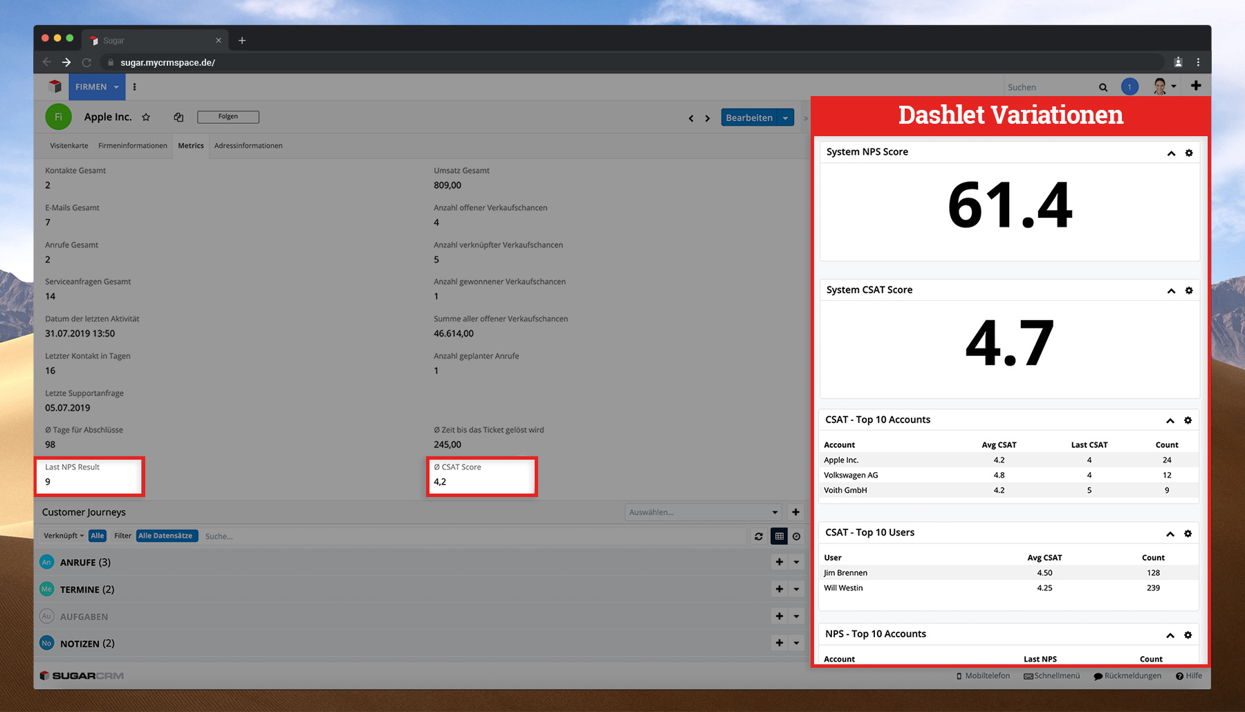 Die Ergebnisse werden pro Ticket erfasst und in der Ticket-Übersicht gespeichert. Ein Durchschnittswert aller mit einer Firma verknüpften Tickets wird in der Firmenübersicht angezeigt. Optional könnten verschiedene Auswertungen zu NPS® und CSAT direkt in der Seitenleiste als Dashlet angezeigt werden.