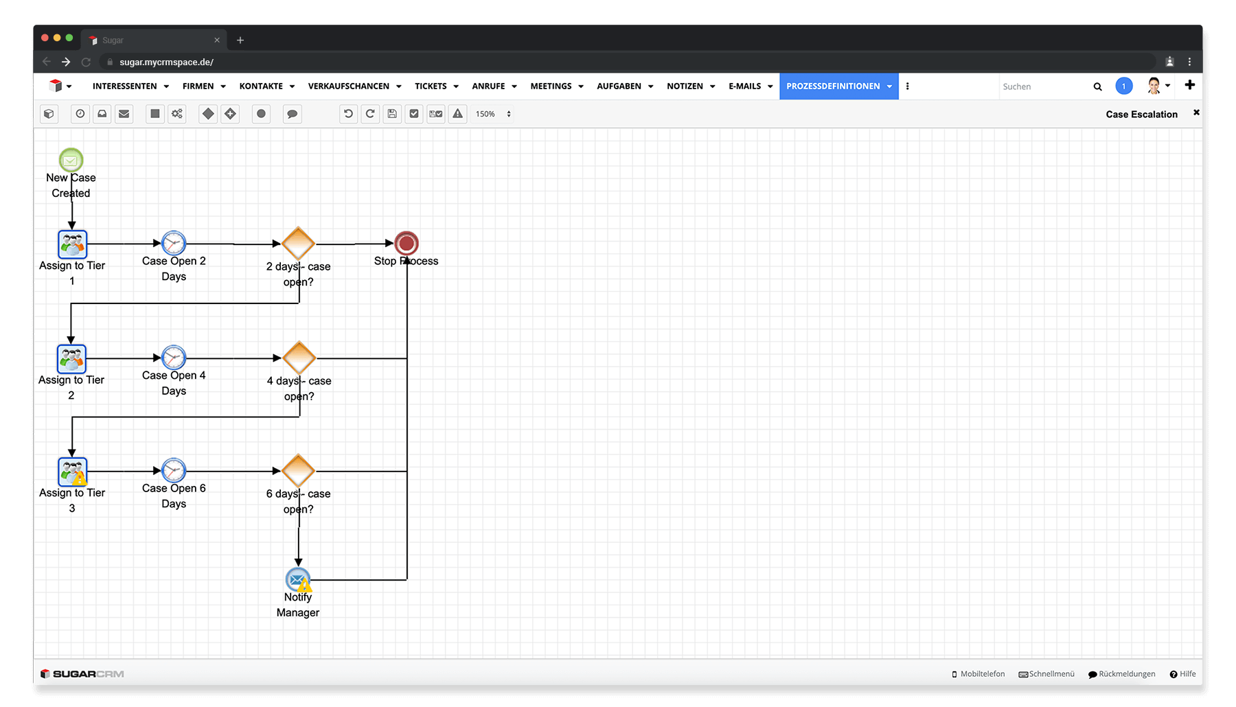 In Sugar könnt ihr Customer Journeys individuell abbilden. Das heißt, du kannst darüber alle Schritte eines oder mehrerer Prozesse festlegen, die von Anfrage bis Abschluss durchlaufen werden müssen. Hier ein Beispiel: