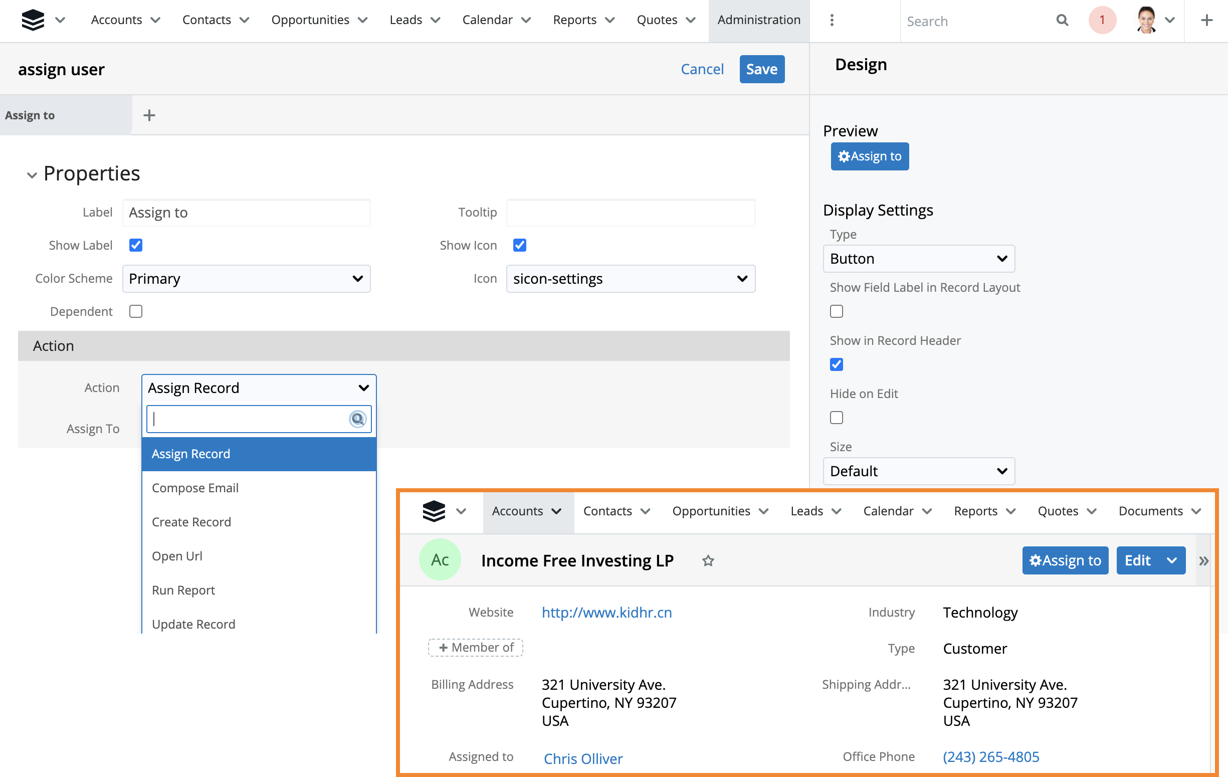 Administratoren können benutzerdefinierte Buttons zur Datensatzansicht hinzufügen, das gibt den Benutzer die Möglichkeit, schnelle Aktionen wie das Senden einer E-Mail, das Erstellen oder Bearbeiten eines verknüpften Datensatzes oder das Öffnen einer externen Webseite direkt in der Datensatzansicht durchführen zu lassen. Dafür steht nun ein neuer Feldtyp in Studio (ActionButton) zur Verfügung. Dieser lässt sich z. B. mit Sugar Logic konfigurieren. Action Buttons sparen Zeit und vereinfacht das Nutzen häufig genutzten Aktionen.