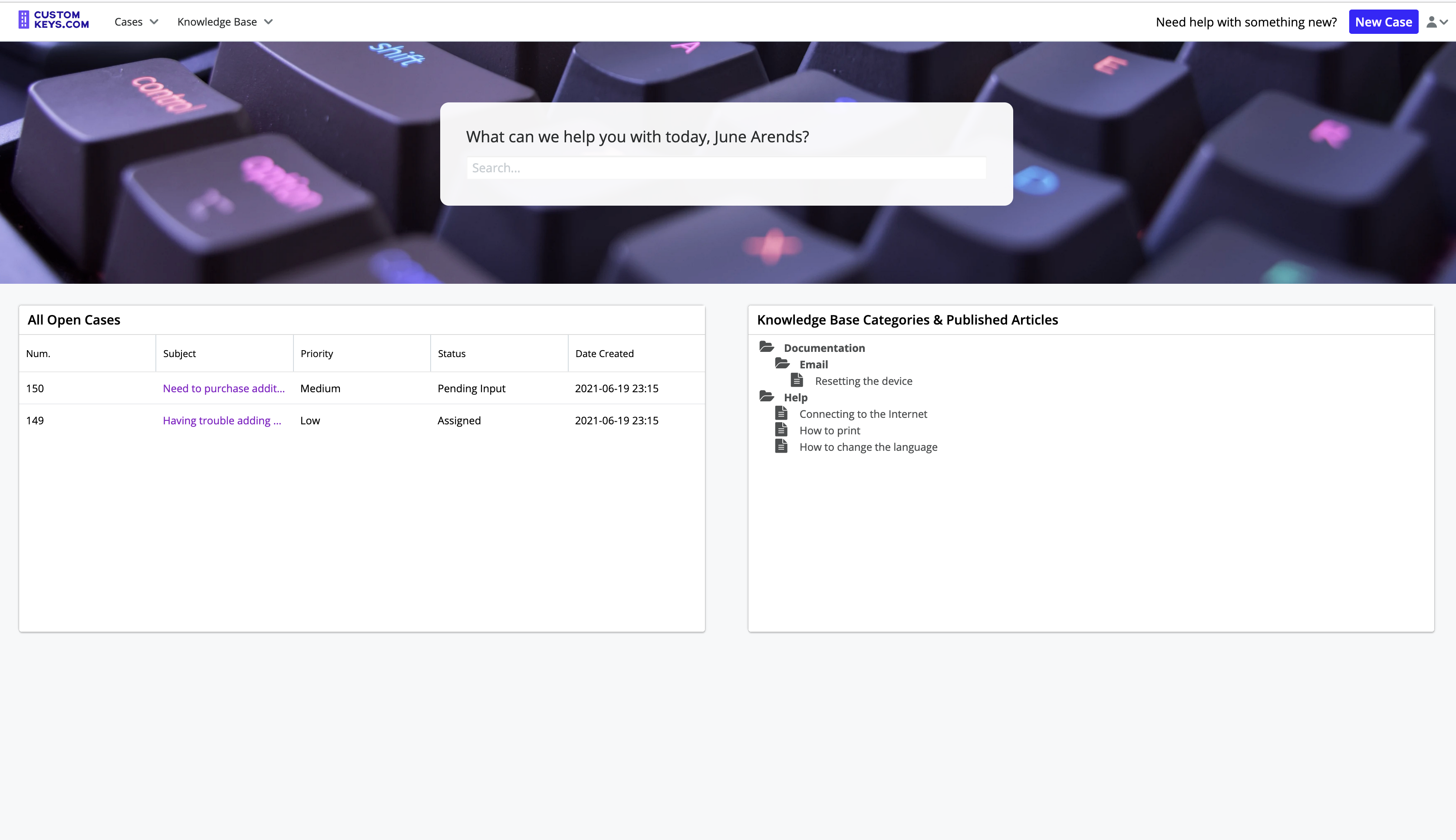 - Zeige auf der Startseite eine Schaltfläche „Neuer Fall“ an, und benenne diese auf Wunsch um, damit Kunden schnell neue Supportfälle einreichen können.