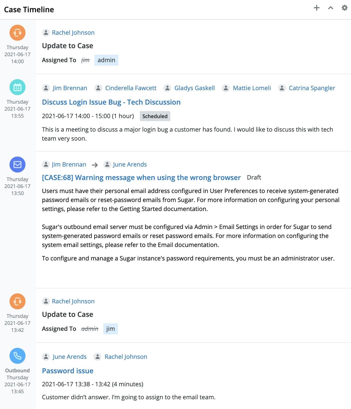 Das Dashlet „Interaktionen“ wurde überarbeitet und in „Zeitleiste“ umbenannt. Das Dashlet „Zeitleiste“ zeigt eine chronologische Liste der mit einem Datensatz verbundenen Aktivitäten zusammen mit ausgewählten Änderungen am aktuellen Datensatz an. Auf kontextbezogene Aktionen kann auch direkt aus dem Dashlet heraus zugegriffen werden, wie z. B. das Beantworten oder Weiterleiten einer E-Mail, das Aufheben der Verknüpfung von Aktivitäten und das öffnen der Datensätze über die Vorschau (Fokus-Drawer).