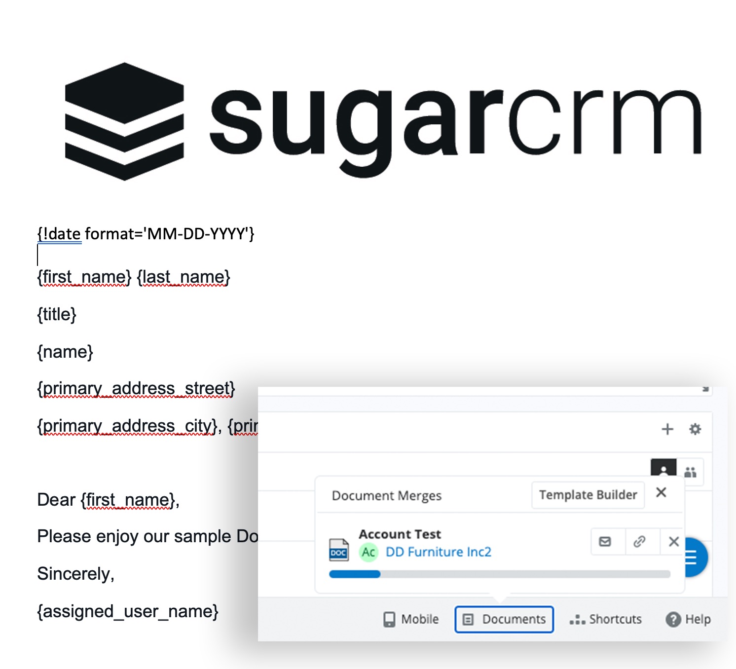 Die Doc Merge-Funktion von Sugar zieht Daten aus den Sugar-Feldern und fügt sie in Dokumentvorlagen ein, ohne dass man Sugar verlassen muss. So können Vorlagen für Verträge, Angebote, NDA-Vereinbarungen, Serienbriefe, Etiketten und vieles mehr schnell erstellt werden.