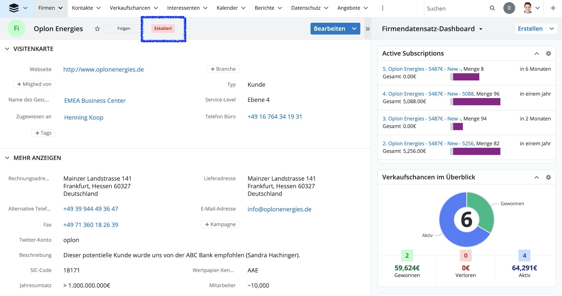 Mit dem neuen Modul „Eskalationen“ Modul können Firmen, Verkaufschancen und Tickets markiert werden, um besser eskaliert werden zu können, ganz unabhängig vom Support, Vertrieb oder Marketing. Die Aktion „Eskalieren“ ist direkt für Datensätze verfügbar, die eskaliert werden können, um ein Problem schnell zu lösen. Bei Datensätzen mit mindestens einer offenen Eskalation wird in vielen Ansichten in Sugar ein gut sichtbarer Eskalations-Badge angezeigt, so dass alle Benutzer, die mit dem Datensatz arbeiten, über dessen Status informiert sind.