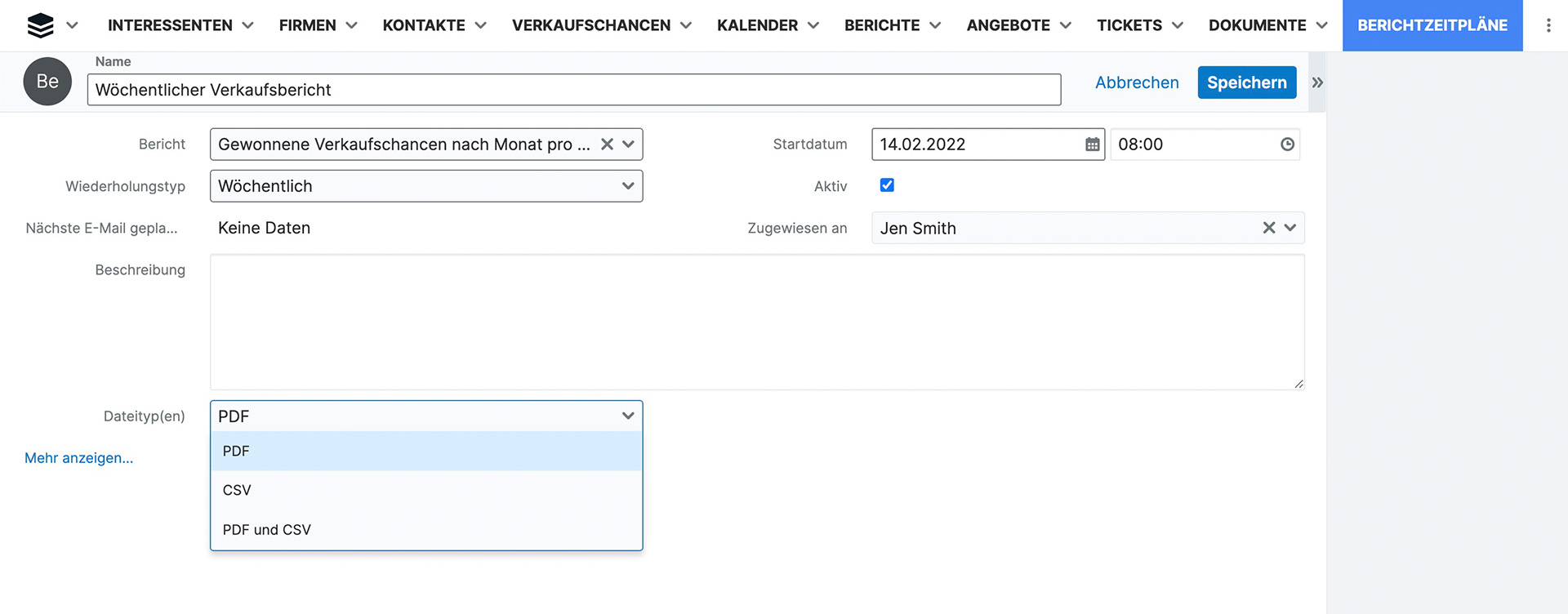 Als Alternative zum PDF, kann man einen Bericht so planen, dass er als CSV-Datei, PDF oder beides gesendet wird, indem man das Feld Dateityp(en) in der Datensatzansicht für Berichtszeitpläne ändert