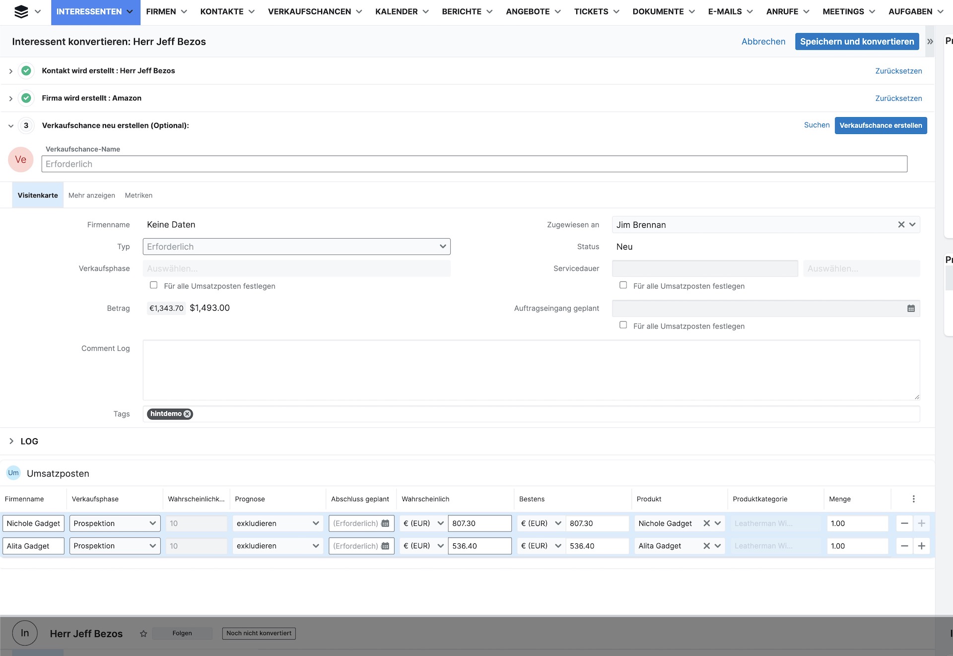 Leads können jetzt schneller konvertiert werden, indem die gesamte Verkaufschance auf der Seite der Lead-Konvertierung möglich ist. Bei der Erstellung einer Verkaufschance während der Lead-Konvertierung können jetzt mehrere Umsatzposten hinzugefügt werden, während zuvor nur eins möglich war.