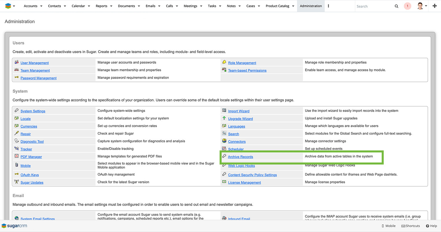 Im Lauf der Jahre sammeln sich in jedem System unzählige Daten an; das ist bei CRM-Tools nicht anders. Um nicht den Überblick zu verlieren, kam mit Sugar 10.3 ein ganz neues Modul hinzu, das nun auch On-Site-Nutzern zur Verfügung steht. Nicht mehr benötigte Datensätze können darüber archiviert oder gleich dauerhaft aus der Datenbank gelöscht werden.