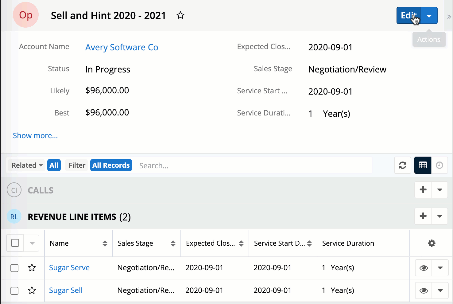 Mit dieser Funktion kann der Vertragsbeginn und die Dauer aller Produkte, die als verlängerbare Service-Abos definiert sind, direkt in der Verkaufschance selbst angepasst werden und nicht mehr wie früher nur durch die Änderung der einzelnen Revenue-Line-Items (Umsatzposten). Das spart viel Zeit, insbesondere wenn du viele Revenue-Line-Items in einer