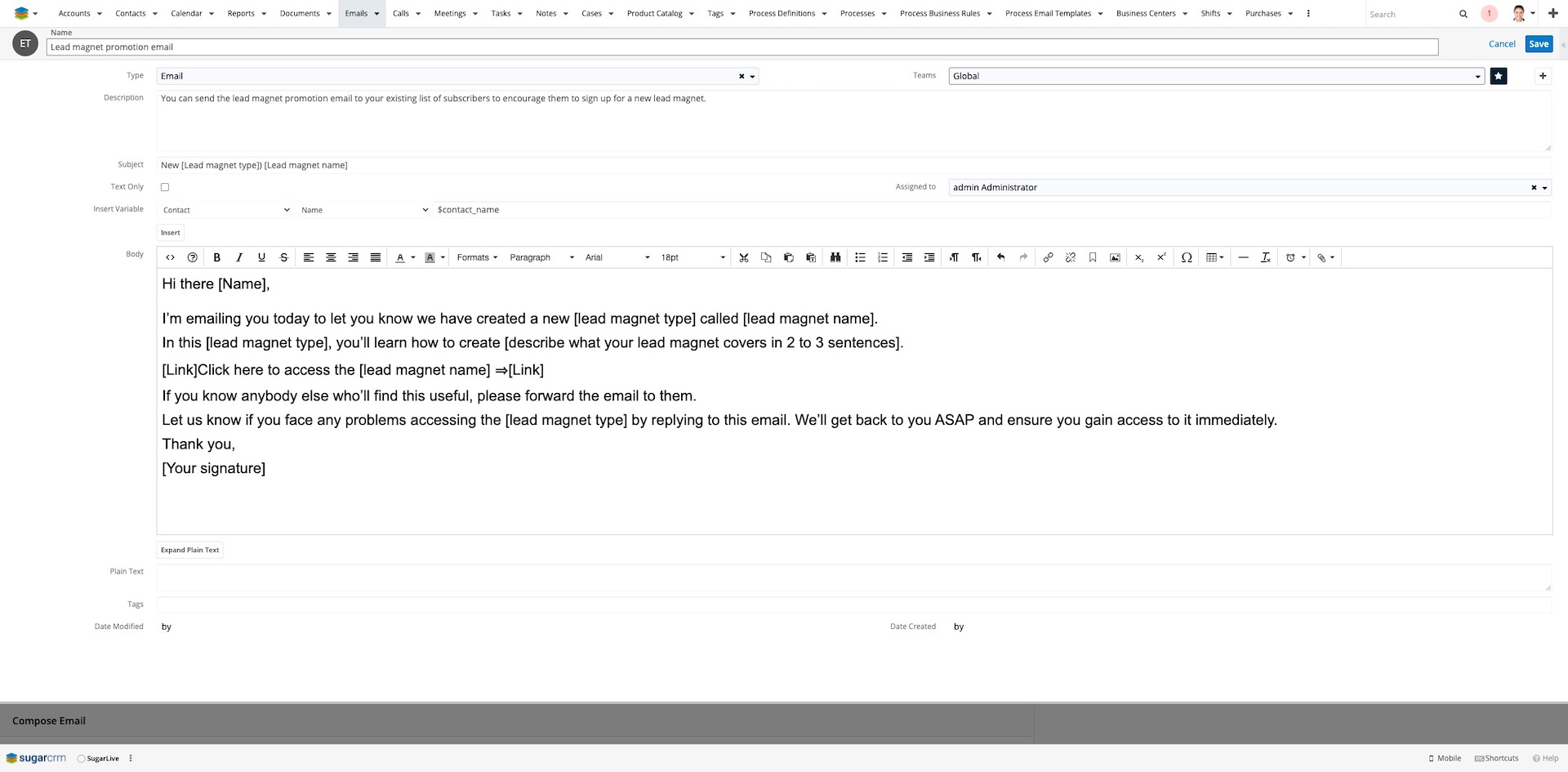 Der E-Mail-Editor hat viele neue Werkzeuge erhalten. Diese waren beispielsweise bisher nur durch MyCRM-Enhancements verwendbar, die wir exklusiv unseren Kunden angeboten haben. Mit diesem Update stehen sie nun allen Sugar-Nutzern zur Verfügung. Damit lassen sich z. B. LinksBilder und Tabellen mit einem Klick hinzufügen. Des Weiteren können nun auch Variablen sehr viel einfacher eingefügt werden oder E-Mails als reine Text-E-Mails versendet werden.