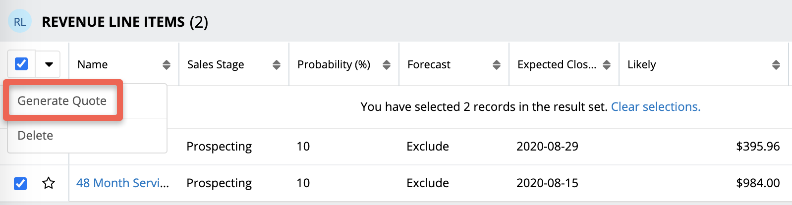 Zur Veranschaulichung ein Beispiel: Du hinterlegst bei einer Verkaufschance 15 Produkte als Revenue Line Items (Umsatzposten), für das Alternativangebot sollen lediglich zehn Produkte berücksichtigt werden. Früher musste man separate Angebote dafür erstellen, jetzt habt ihr die Möglichkeit, individuell zu steuern, welche Umsatzposten in das Angebot übernommen werden sollen.