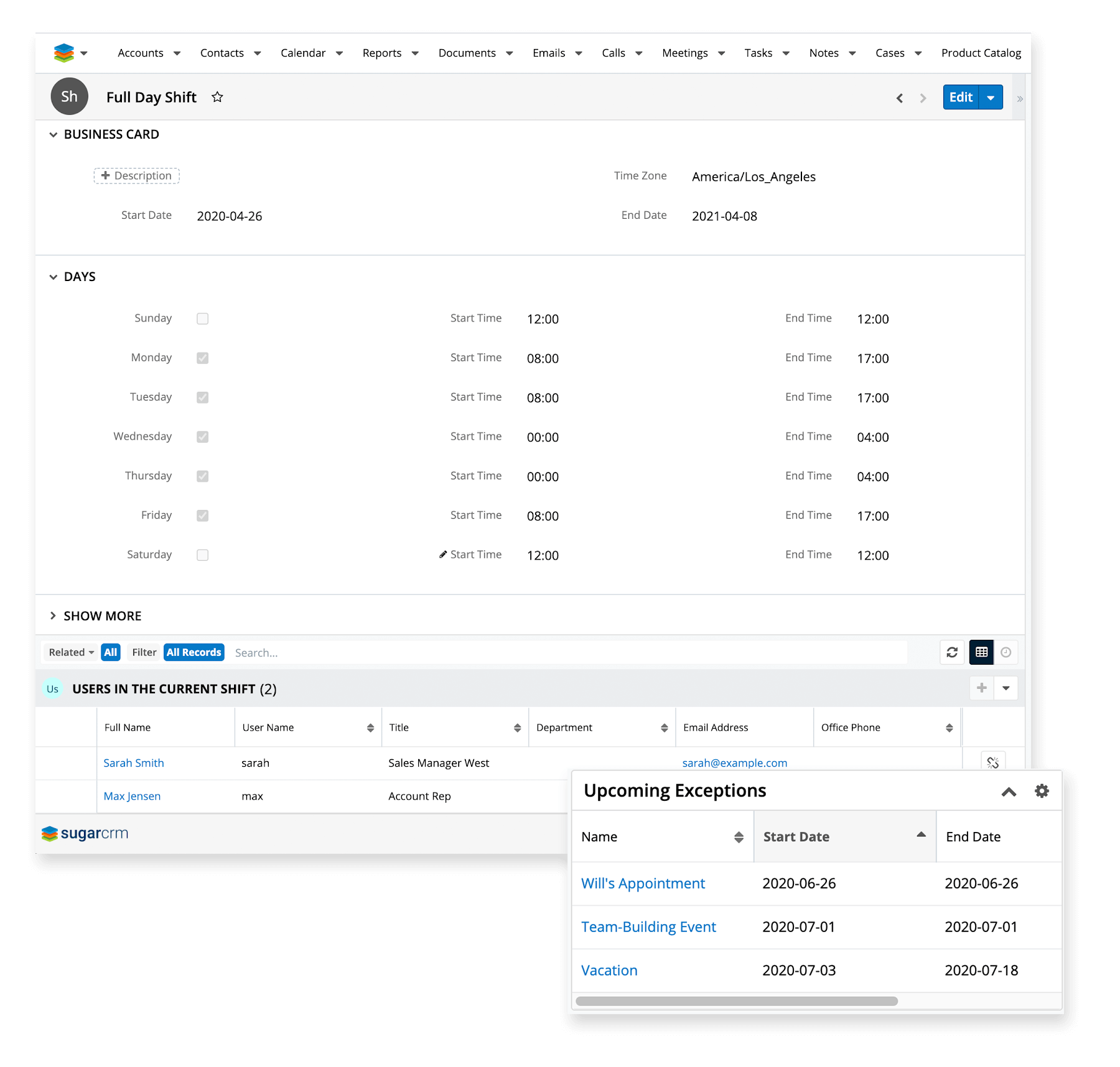 Ab sofort können die Arbeitszeiten (Schichten) von Mitarbeitern sowie Ausnahmen eingetragen werden, etwa für Urlaub, Elternzeit oder Weiterbildungen. Wenn man mit Workflows arbeitet und beispielsweise Anfragen Mitarbeitern zuweist, damit sie zeitnah bearbeitet werden, ist es natürlich sinnvoll, es nur zu tun, wenn sie auch wirklich verfügbar sind.