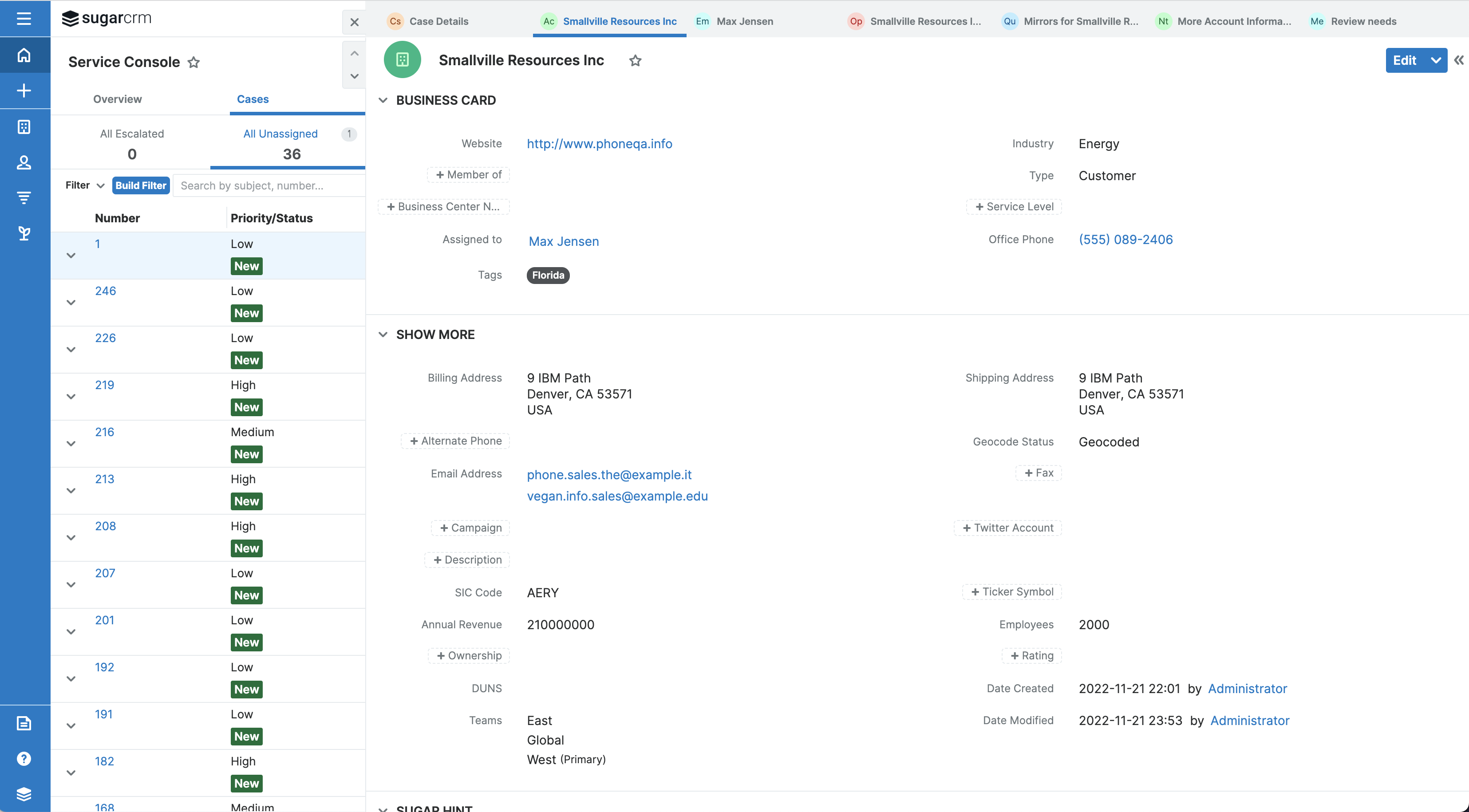 Zum Beispiel können die Agenten jetzt die Größe der Spalten nach Bedarf ändern. Sie können auf einen der Datensatz-Links in der mehrzeiligen Listenansicht klicken (z. B. ist die Spalte „Konto“ jetzt ein Link, der die Datensatzansicht des Kontos in einer Registerkarte öffnet) und auf die Registerkarte „Übersicht“, um die Datensatzansicht in der Fokusschublade der Konsole zu öffnen.