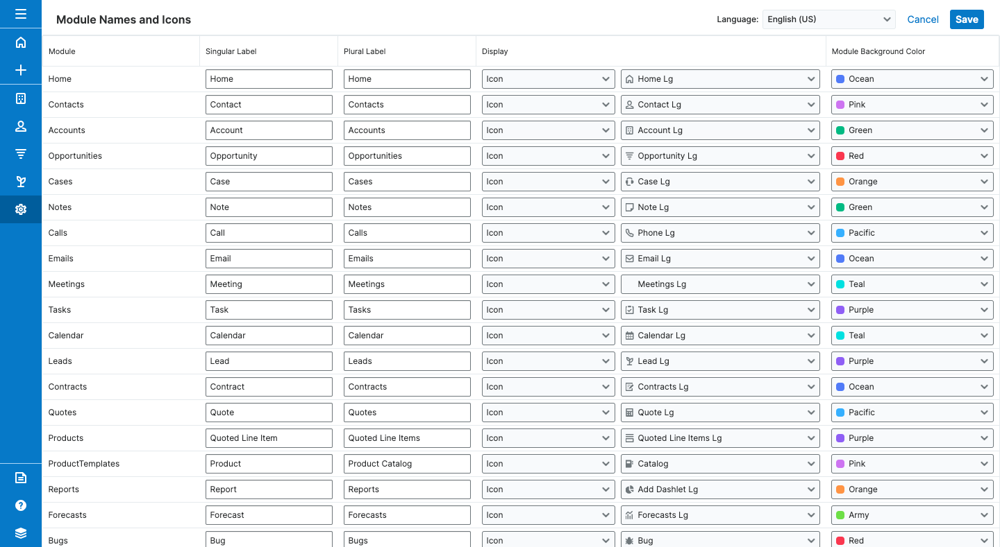 SugarCRM hat dazu noch seine frühere Funktion „Module umbenennen“ vollständig überarbeitet und es heißt jetzt „Modulnamen und -symbole“. Dort kann man zu dem Namen und dem Displaylabel noch das Icon definieren und die Hintergrundfarbe für das Modul.