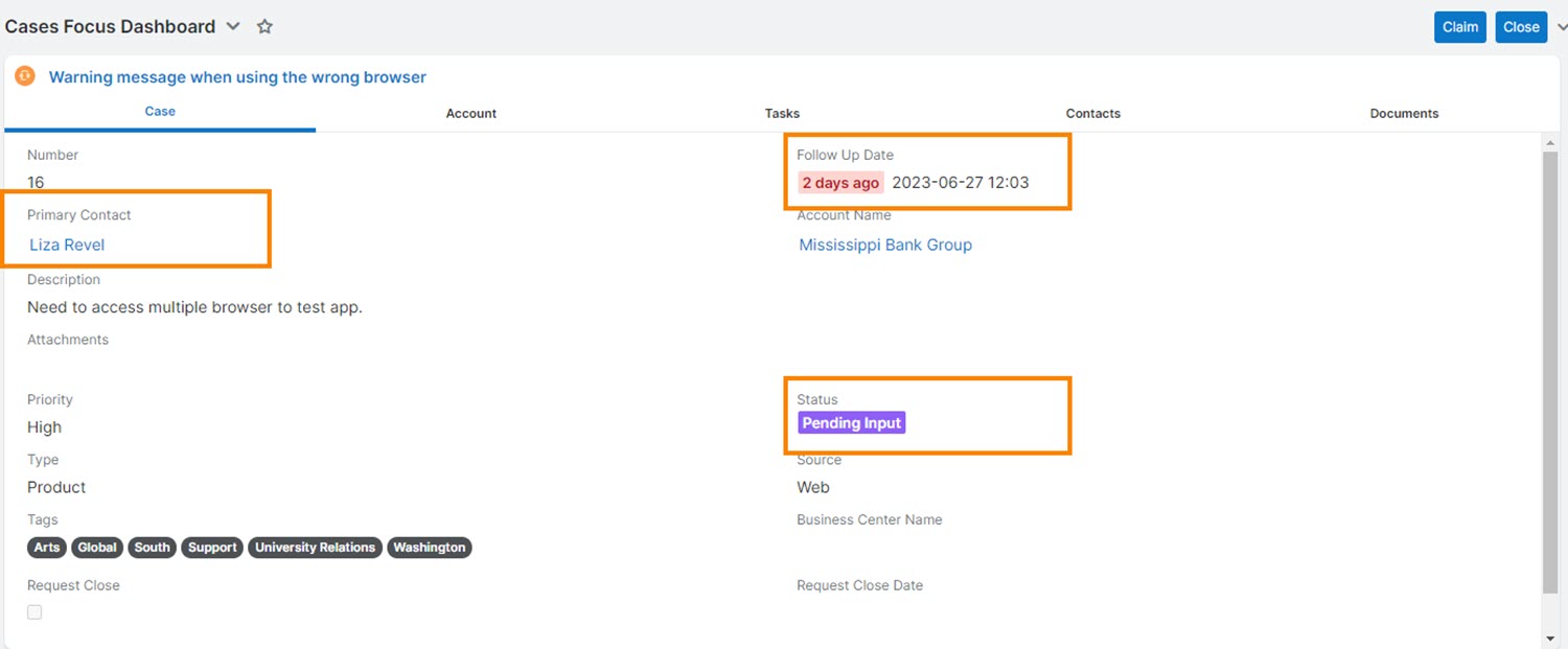 Das Dashlet der Falldatensatz-Ansicht wurde um das Feld für den primären Kontakt, die Hervorhebung des Statusfeldes für die Echtzeit-Transparenz und die SLA-Plaketten (Service Level Agreement) für das Follow-up-Feld erweitert. Diese Verbesserungen bieten einen umfassenden Überblick und steigern die Effizienz für Service-Agenten.