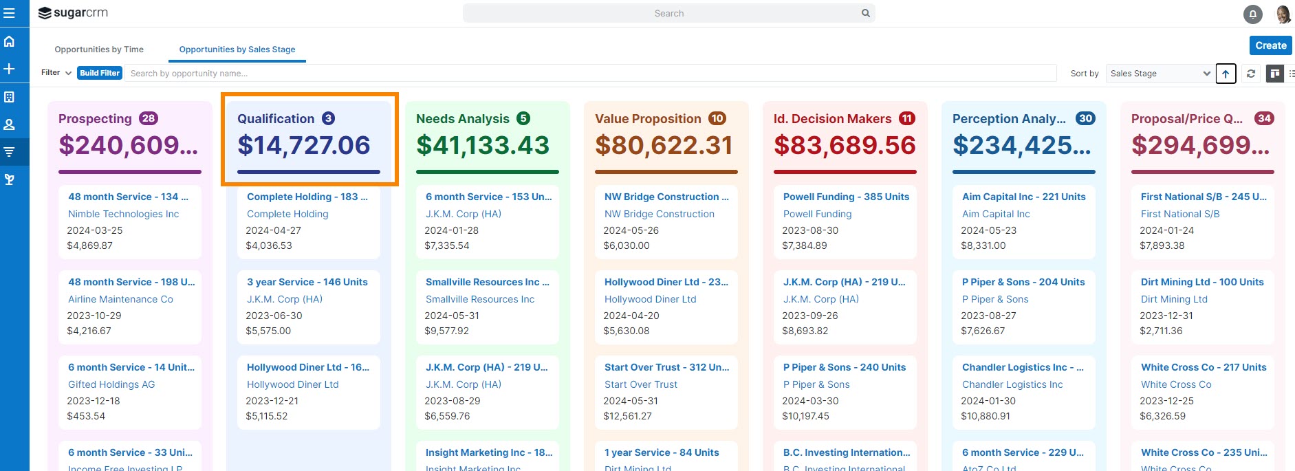 - Um den Einblick in die Daten zu verbessern, wurde die Anzahl der Datensätze und die Gesamtsumme in die Spaltenüberschriften integriert. So können Benutzer jetzt beispielsweise die Datensätze innerhalb einer bestimmten Verkaufsstufe und die Gesamtzahl der Datensätze in der Verkaufsstufe „Neu“ sehen, auch wenn diese nicht sichtbar sind.